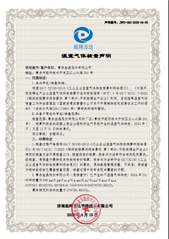 青岛金晶股份有限公司 《温室气体核查声明》和《产品碳足迹声明